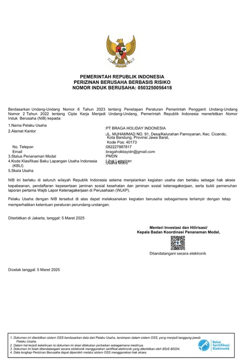 Sebagai perusahaan yang terdaftar secara legal dengan Nomor Induk Berusaha (NIB), kami hadir untuk memberikan keamanan, kenyamanan, dan transparansi dalam setiap perjalanan Anda.